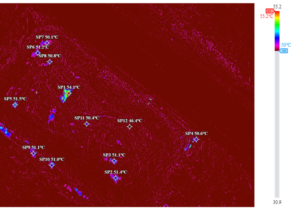 Dari hasil pemetaan awal, ditemukan beberapa titik dan area dengan rentang suhu antara 40°C hingga 60°C. Area yang mendekati dan melewati 50°C menjadi perhatian khusus karena berada di atas batas aman yang direkomendasikan sebelum distribusi. Data thermal yang telah diproses di DJI Terra kemudian dianalisis untuk menentukan lokasi presisi hotspot, termasuk estimasi luas area terdampak.